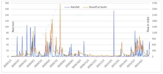 River flow fluctuations in response to precipitation (and technically to the soil moisture) at Guilin subbasin.