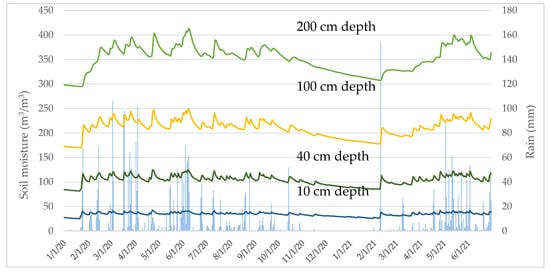 In terms of soil moisture, as illustrated in Figure 6, the response of the soil water content to the rain in deeper layers is proportionally less, with lower reoccurrence frequency, and in slower rates compared to the top layers. For instance, from 16 October 2020 to 31 January 2021 which was the longest interval of the dry season (discarding a few small rainfalls), the water content was reduced from 37.12 to 26.75 which is a 28% moisture loss; while there was a 200 cm decrease between 21 October 2020 and 9 February 2021 from 354.65 to 307.38, which is a 13.3% reduction. Another point observed was that the soil moisture fluctuation had a higher lag time at the lower depths. As in the abovementioned example, the water content at the 200 cm depth begin to decline 4 days after it was started at the 10 cm depth at the beginning of the dry season and continued to decline 9 days after the water content at 10 cm depth begin to raise at the end of the dry season. Moreover, the fluctuation occurrences at the shallow soil layers was more frequent than in deep soil, in which any small rainfall might cause saturation at the 10 cm depth while it may not impact the gradient trend at the 200 cm depth. Thus, we can see a continuous upward trend for 200 cm soil moisture from 25 January to 17 February 2020; while, at the 10 cm depth the water content fluctuated three times during this period.