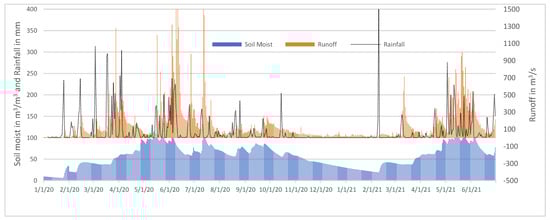 Daily soil moisture and runoff vs. rainfall in Guilin for 1.5 years. Soil moisture values are −300.