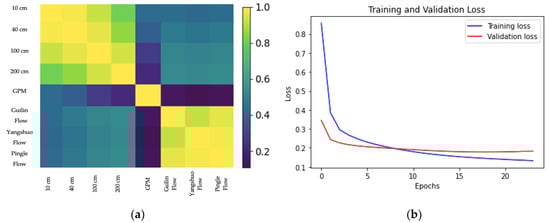 The correlation degrees (C) were orderly including significantly correlated 0 ≤ C < 0.2, correlated 0.2 ≤ C < 0.4, medium correlated 0.4 ≤ C < 0.6, weekly correlated 0.6 ≤ C < 0.8, and no correlation 0.8 ≤ C < 1. Numbers 1–8 show the eight introduced parameters (including 1–4 the soil water content at 10–200 cm depts, 5 the GPM precipitation, and 6–8 the flow in the three subbasins). As an example, flow in the second subbasin (Yangshuo as parameter 7) is significantly correlated with precipitation (dark color), correlated with the soil moisture, a weakly correlated with the Guilin flow (parameter 6), and shows no correlation with itself (yellow color) or the Pingle (parameter 8). Figure 8b shows the validation graph for the neural network algorithm error minimization. In this graph, lower amounts of loss show how accurate was the model prediction in which zero loss shows a perfect prediction. Epoch indicates the number of completed passes for the algorithm data set (24 epochs in our case).
