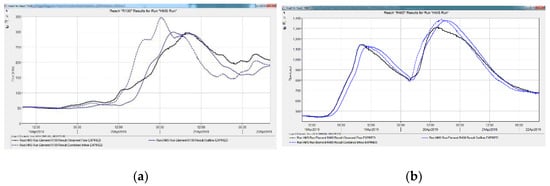 After the inclusion of the soil moisture accounting loss and the dams into the model, the generated hydrographs were improved (Table 1). The nine simulated graphs of the floods were compared with actual data as well as with the initial model forecasts. Below two hydrographs (Figure 9a,b) are the given examples for the same events and locations (as in Figure 4) regenerated via the modified HEC-HMS. The simulated graphs in blue for both events have high similarities with their actual graphs in black. In Yangshuo, with a double peak hydrograph (in which the first bump is the dam release prior to an estimated heavy rainfall), both peaks were forecasted as we also included the dams in the model. The NSE values from −1.24 for Yangshuo and 0.69 for Guilin (Figure 4a,b) increased to 91% and 95%, respectively, which showed a high forecasting accuracy.
