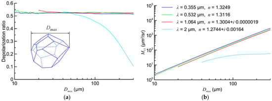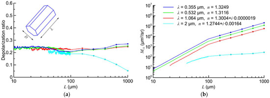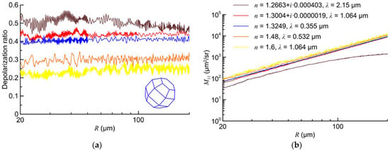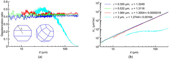 Additionally, it is seen that the appearance of light absorption inside crystals at λ = 2 μm leads to the essential decrease of the depolarization ratio (see in the cyan-color curves in Figure 1, Figure 2, Figure 3, Figure 4, Figure 5 and Figure 6). In its turn, this fact can be used for inferring the crystal sizes.