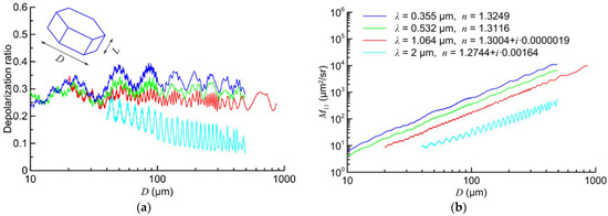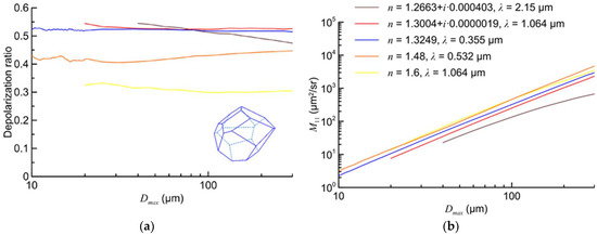 These important results have the following qualitative explanation. Let us remind that the backscattered light within the physical-optics approximation is a set of outgoing spherical waves, where every wave is associated with a geometric-optics plane-parallel beam propagating inside the crystal. Every beam is characterized by its trajectory, describing a succession of reflections by crystal faces. When a crystal size increases, the transverse size of any beam increases too, but the shape of the trajectory remains the same. The depolarization ratio of Equation (6) depends only on the trajectory shape. Consequently, the depolarization ratio does not change at increasing crystal size. On the contrary, a change of the refractive index leads to new geometries of the beam trajectories. It is obvious that the higher the number of reflections along the backscattered trajectories (i.e., the less is the refractive index), the higher the depolarization ratio. This fact is demonstrated in Figure 2.