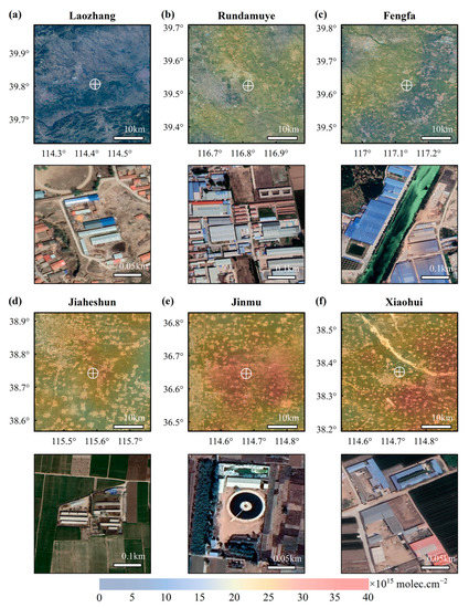 Satellite images of the six feedlots reveal that Jiaheshun (in Baoding city, Figure 2d) has relatively open-air feedlots, while Laozhang (in Zhangjiakou city, Figure 2a), Rundamuye (in Langfang city, Figure 2b), Fengfa (in Hengshui city, Figure 2c), Jinmu (in Zhangjiakou city, Figure 2e), and Xiaohui (in Hengshui city, Figure 2f) livestock feedlots are completely closed indoor livestock feedlots. Laozhang is a pig feedlot, which is located in the villages and towns in the mountainous flat area and has the lowest NH3 column (10.0 × 1015 molec·cm−2). Fengfa (37.2 × 1015 molec·cm−2) is a dairy feedlot located on both sides of the canal. The column of Jinmu is high (47.5 × 1015 molec·cm−2) and located in the farmland with a large garbage pit.