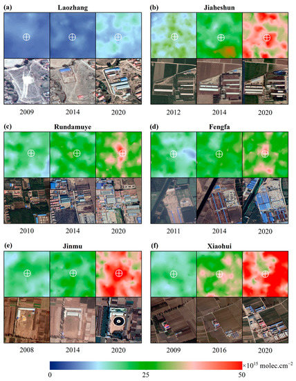 Changes in NH3 columns and livestock farms. (a–f): the feedlots of Laozhang, Rundamuye, Fengfa, Jiaheshun, Jinmu and Xiaohui.