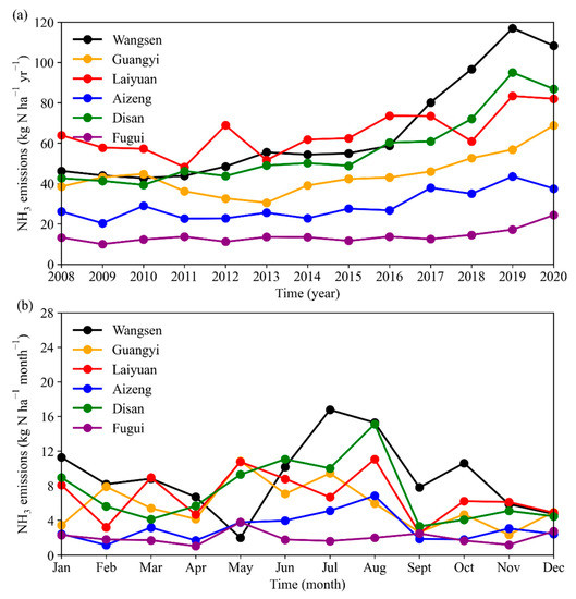 The impact of increasing ammonia (NH3) emissions on the environment has received extensive attention [1,2]. As an essential alkaline gas and aerosol precursor in the atmosphere, NH3 reacts with acidic substances (such as nitric acid and sulfuric acid vapor) to generate secondary inorganic aerosols, and then forms fine particles that are indirectly harmful to human health [3,4]. Studies have indicated that future NH3 emission reduction is a cost-effective PM 2.5 control strategy, compared to further control of SO2 and NOx [5,6]. In addition, the deposition of excess nitrogen from NH3 emissions into terrestrial and aquatic ecosystems through wet and dry deposition can cause biodiversity loss, which, in turn, causes soil acidification and the eutrophication of aquatic environments [7,8]. The impact of NH3 on greenhouse gases cannot be ignored either. NH3 is an indirect source of nitrous oxide [9], and its deposition also affects carbon dioxide sequestration [10,11].