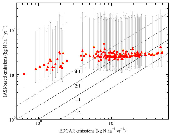 In addition to the calculation model and NH3 lifetime, the uncertainty of the IASI measurements can contribute to the uncertainty of the NH3 emissions. Previous studies have shown that the IASI measurement is more likely to underestimate the NH3 columns than overestimate them [21], and the columns may have an uncertainty of 25%–50% [37,45].