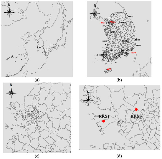 The study was conducted using four domains while applying the nesting method. Selected domains are shown in Figure 1. A 118 × 125 domain of 27 km square grid (D01) encompassing East Asia includes Japan, Korea, and the eastern part of China. A 67 × 79 domain of 9 km square grid (D02) focuses on the Korean peninsula. According to the CAPSS national emissions inventory for 2017, RKSI accounted for about 50% of the total aviation emissions among the fifteen airports in Korea. Also, the four major international airports (RKSI, RKSS, RKPK, and RKPC) are responsible for more than 90% of total aviation emissions. To more efficiently analyze the pollutants emitted from the two airports serving the capital area of Seoul, a 60 × 63 domain of 3 km square grid (D03) and an 82 × 64 domain of 1 km square grid (D04) were utilized for the Seoul metropolitan area and the airport area, respectively, which includes RKSI and RKSS. Specific boundaries were decided based on the standard modeling domain used for national atmospheric policy studies [31].