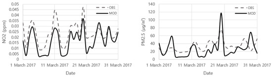 The model’s average concentration for NO2 for the cell including the comparison monitoring site was 0.017 ppm, underestimated compared to the observation data’s 0.024 ppm. The daily concentration showed a similar trend, with the model result mostly lower than the measured values except for 25th and 28th of March 2017. The average PM2.5 concentration of 26 μg/m3 was also underestimated in comparison to the measurement data average of 33 μg/m3. However, the trends between the two values are again quite similar while modeled values are relatively smaller overall.