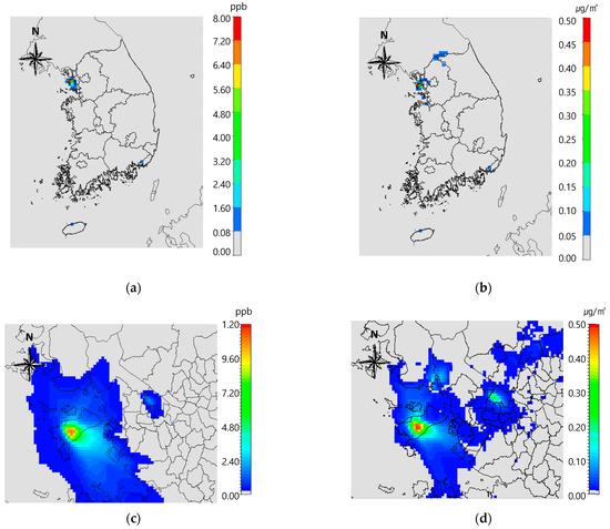 Impact of aviation on NO2 for nationwide domain (a) and airport area domain (c). Impact of aviation on PM2.5 for nationwide domain (b) and airport area domain (d).