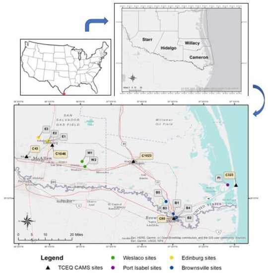 - Mendez, E.; Rodriguez, J.; Luna, A.; Raysoni, A.U. Comparative Assessment of Pollutant Concentrations and Meteorological Parameters from TCEQ CAMS Sites at Houston and Rio Grande Valley Regions of Texas, USA in 2016. Open J. Air Pollut. 2022, 11, 13–27. [Google Scholar] [CrossRef]