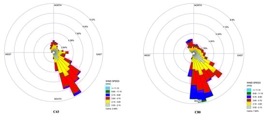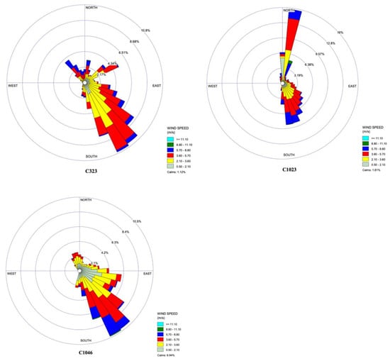 Wind rose diagrams for the RGV CAMSs C43, C80, C323, C1023, and C1046 during the study duration from 1 March 2021 to 31 March 2022.