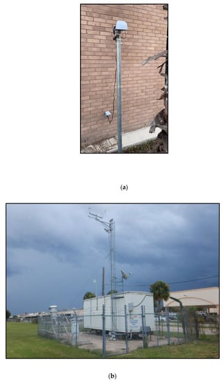 The LCSs used in this research study were BlueSky™ Air Quality Monitors, TSI Inc., Shoreview, MN, USA (Model: 8143). Figure 3a shows a picture of the BlueSky™ sensor at one of the study locations. For comparative assessment, Figure 3b shows the location of the TCEQ CAMS C43 site. These sensors include a six-channel particulate counter to measure particulate matter mass concentrations and additional parameters, i.e., temperature and relative humidity. The aerosol mass concentrations are depicted from 0 to 1000 μg/m3, with a measurement resolution of 1 μg/m3 []. Furthermore, the PM sensor is pre-calibrated with a self-diagnostic ability to attain performance with more than 95% up-time and acquire high-quality real-time data []. For the purposes of this paper, we have presented only PM2.5 data. PM2.5 (µg/m3) concentrations were collected at five-minute intervals and converted into hourly concentrations for the analyses.