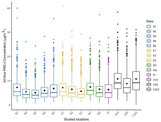 The box and Whisker plot for PM2.5 24 h concentrations (μg/m3) for the eleven LCSs and three CAMS sites for the entire study duration is shown in Figure 4. The Brownsville sites B1, B2, B3, B4, and B5 are shown in deep blue, E1, E2, and E3 are shown in gold for the city of Edinburg; sites W1 and W2 located in the city of Weslaco are shown in green; and lastly, site PI at Port Isabel is shown in purple. The three CAMS sites, C43, C80, and C323, are shown in black. Descriptive statistics of 24 h ambient PM2.5 concentrations (μg/m3) from the LCS sites and the three CAMSs (C43, C80, and C323) are presented in Table 4. Each LCS site was chosen to accurately represent daily intra- and inter-urban PM2.5 exposures at the neighborhood level.