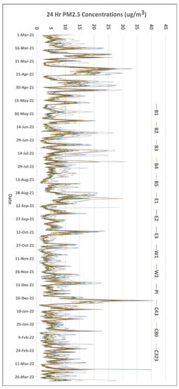 Figure 5 shows the time series for the 24 h PM2.5 concentrations for the study period from 1 March 2021, to 31 March 2022, at the eleven study sites and the three CAMS locations. These temporal patterns observed across the four cities reveal a similar pattern albeit with varying absolute concentrations. High peak levels were ubiquitous throughout the study landscape from 23 December 2021 to 3 January 2022. This could, perhaps, be attributed to Christmas and New Year festivities, which are typically celebrated with firework displays and outdoor cookouts—a trend also seen during the 4 July US Independence Day weekend.