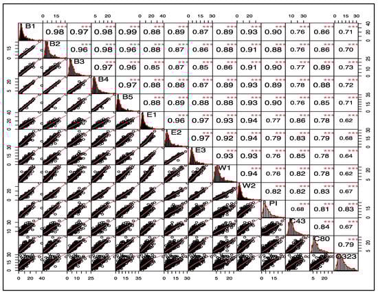 Inter-site correlation analyses were undertaken between the sampled and TCEQ CAMS sites to characterize the PM2.5 temporal patterns for the study duration. The correlation coefficient values computed as Spearman’s Rho are shown in a matrix in Figure 6. The Spearman’s Rho correlations plot also show the density functions, histograms, and smoothed regression analysis. Histogram curves and regression analyses corroborate the similarity in temporal relationships between all the sampled and TCEQ CAMS sites.