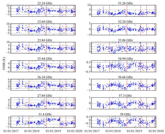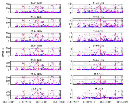 Time series diagrams of OMB of 14 channels, where the pink dots are precipitation times, the blue dots stand for non-precipitation times, and the red dashed lines represent the dates of MWR calibration (7 November 2017, 28 August 2018, 17 April 2019, 25 July 2019, and 6 December 2019).