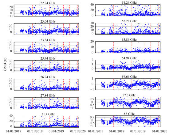 Time series diagrams of OMB of 14 channels in the no-precipitating cloudy weather (the red dashed lines are the dates of MWR calibration).