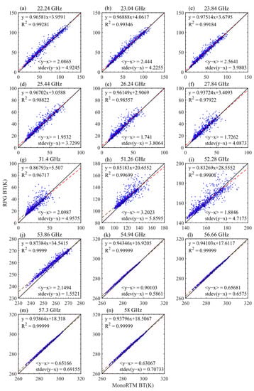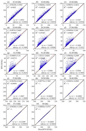 Scatter diagrams of observed BTs and simulated BTs in the clear sky (the red dashed lines denote fitting straight lines). (a) 22.24 GHz, (b) 23.04 GHz, (c) 23.84 GHz, (d) 25.44 GHz, (e) 26.24 GHz, (f) 27.84 GHz, (g) 31.40 GHz, (h) 51.26 GHz, (i) 52.28 GHz, (j) 53.86 GHz, (k) 54.94 GHz, (l) 56.66 GHz, (m) 57.30 GHz, and (n) 58.00 GHz.
