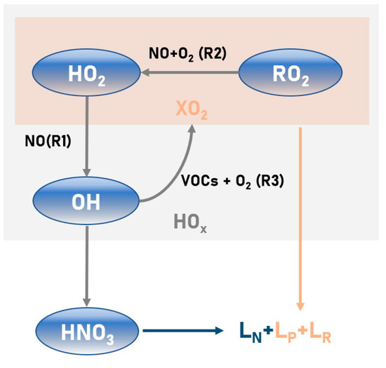Theoretical framework of the HOx radical cycle. This framework considers the rates of radical losses due to particle uptakes (), peroxide formation (), and reactions (). Mainly, the reaction of NO with the peroxy radicals () (Equations (1) and (2)) and the reaction of OH with VOCs (Equation (3)) are included.