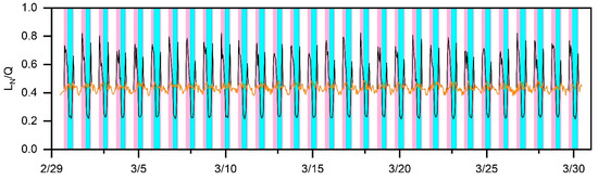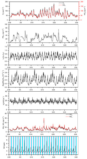 Figure 2 presents the monthlong predictions of in the base scenario for March 2020. More importantly, the transition (Equation (26)) between the NOx- and VOC-sensitive regimes is shown quantitively. This indicates that periods with lower values are more sensitive to NOx (shaded areas in cyan), while those with higher values are more sensitive to VOCs (shaded areas in pink). Note that such a transition was not considered as in the nighttime when the photochemical reactions did not occur. Consequently, we found clear boundaries between the NOx- and VOC-sensitive regimes. Specifically, the VOC-sensitive regimes were dominant in the morning and evening, while became more NOx-sensitive in the afternoon. Unexpectedly, when winter turned into spring, such transition characteristics in the suburbs were similar to those in the megacities [32,33]. It should be noted that the large uncertainties in the low [NO] (<0.2 ppb) (close to the detection limit of the instrument) would be propagated to a lower than the transition threshold. Hence, when approaches 0.2, its relative uncertainty might be 50%.