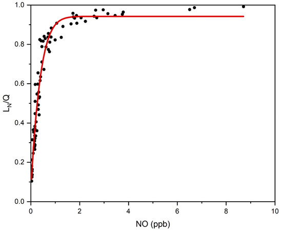 As shown in Equation (36), there were four terms, i.e., , , , and , that dominated in . Figure 3 shows their explicit the temporal variations. Therein, [NO] presents the largest fluctuations, with an amplitude of two orders of magnitude, while the amplitude of other variables varied by less than one order of magnitude. Figure 4 presents the relationship between and [NO]. It was immediately clear that most of the variations in the former relied on the changes in the latter, especially when the [NO] decreased to less than 0.2 ppb. As illustrated in Figure S4, the periods with the lower [NO] (<0.2 ppb) consistently corresponded to the NOx-sensitive regime. Therefore, our results indicate that, while the transition between the VOC- and NOx-sensitive regimes was related to , , and , the NO depletion played a roughly dominant role in the decreases, and thus, the sensitivity regime transitions during this field campaign.