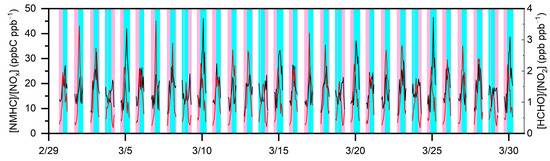 Temporal changes in [NMHC]/[NOx] and [HCHO]/[NO2] from 1 March to 30 March, 2020 (UTC).