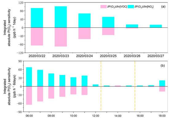 (a) Day time in each day and (b) 6 days at each time variations in and from 22 March to 27 March 2020 (UTC). Throughout this period, the total absolute sensitivities on NOx were less than those on VOCs. In the afternoon (between the two yellow dashed lines), the absolute sensitivity of NOx might exceed that of VOCs, indicating the NOx-sensitive period.