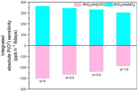 In the base case, particle uptakes with γ = 0.2 narrowed the absolute values of positive and negative by 4% and 11%, respectively. This suggests that particle uptakes consistently inhibited not only the impacts of VOC mitigation on the reductions by 4% but also those of NOx reduction on enhancements by 11%. With the increases in γ, such inhibitions were further amplified. If γ = 1.0, the absolute values of and negative were reduced by 16% and 38%.