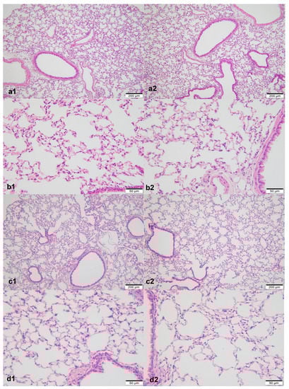 The effect of 1.1 ppm O3 exposure 4 h/day for 15 or 30 days on the micromorphological changes of lungs in experimental mice. (a1) Control, 15 days, HE, ×100; (a2) O3, 15 days, HE, ×100. (b1) Control, 15 days, HE, ×400; (b2) O3, 15 days, HE, ×400. (c1) Control, 30 days, HE, ×100; (c2) O3, 30 days, HE, ×100. (d1) Control, 30 days, HE, ×400; (d2) O3, 30 days, HE, ×400. Compared with the controls, there was no obvious abnormality to be observed in the O3 exposure groups in the structures of the bronchial tubes at all levels in the lung seemed normal, and there were no expansion or contraction of the alveolar cavity, no inflammatory cells, no expansion or stenosis of the interstitial blood vessels, and no inflammatory cell infiltration.