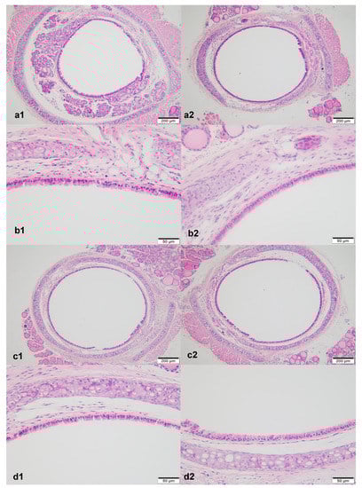 The effect of 1.1 ppm O3 exposure 4 h/day for 15 or 30 days on the micromorphological changes of bronchi in experimental mice. (a1) Control, 15 days, HE, ×100; (a2) O3, 15 days, HE, ×100. (b1): Control, 15 days, HE, ×400; (b2) O3, 15 days, HE, ×400. (c1) Control, 30 days, HE, ×100; (c2) O3, 30 days, HE, ×100. (d1) Control, 30 days, HE, ×400; (d2) O3, 30 days, HE, ×400. Compared with the controls, there was no obvious abnormality to be observed in the O3 exposure groups, and there were no damaged or shed epithelial cells, no vasodilation in the interstitium, and no infiltration of inflammatory cells.