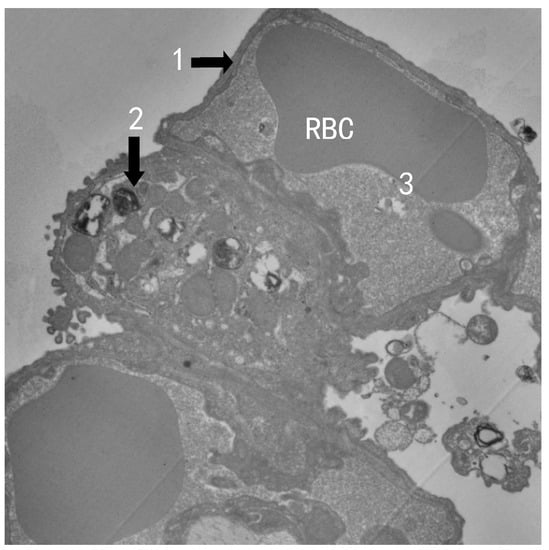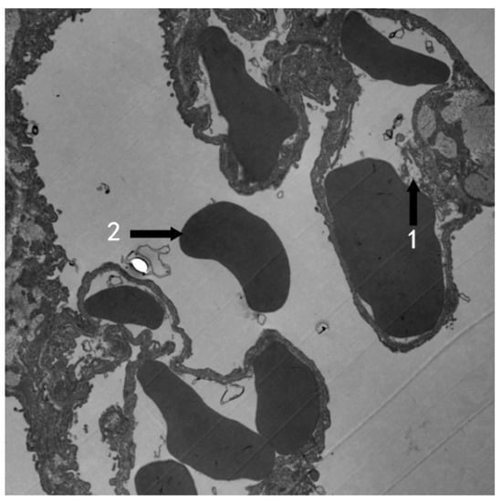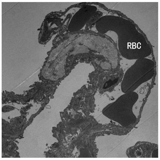 Exposed to 1.1 ppm O3 4 h per day for 30 days, shed endothelial cells were observed from the alveolar capillaries of mouse. Red blood cell was found in the alveolar space, suggesting possible bleeding (Figure 10).