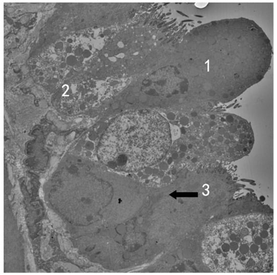 The mouse bronchus of the control (×10,000). Goblet cells (1) and columnar cells (2) have no abnormalities, and tight junctions (3) between the cells are intact.