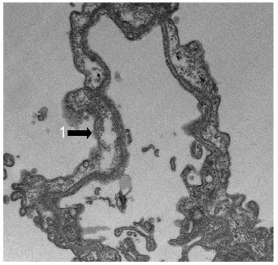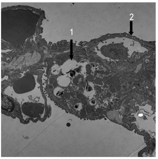 Mouse alveoli exposure to 1.1 ppm O3 4 h/day for 15 days (×15,000). Type I alveolar epithelial cells (1) swell with irregular edges, and many small vacuoles can be seen in the cytoplasm.