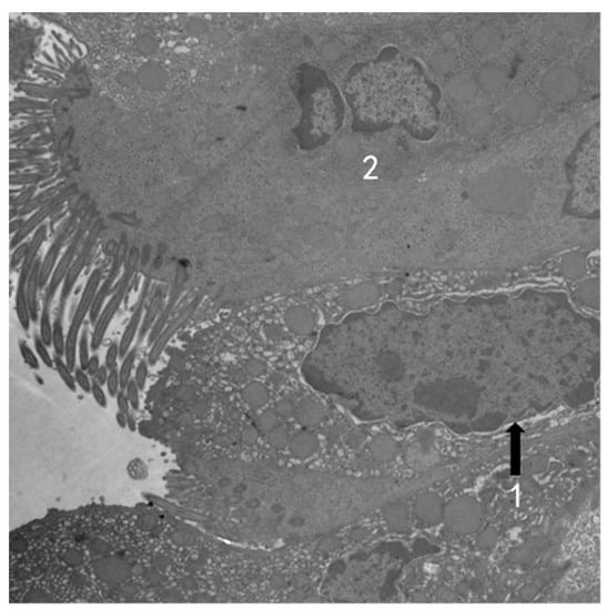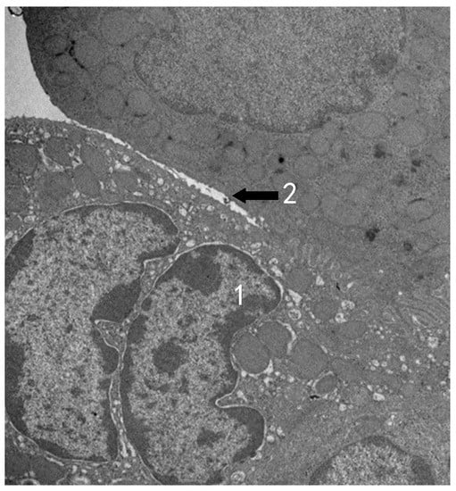 Mouse bronchus exposure to 1.1 ppm O3 4 h/day for 15 days (×10,000). Binuclear goblet cells can be seen (1). Damaged tight junctions between cells were observed (2).