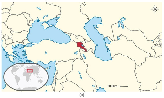 Maps of (a) the world (Armenia is in red) and (b) of Armenia (3 cities of this study—Yerevan, Vanadzor and Hrazdan—are marked with ovals).