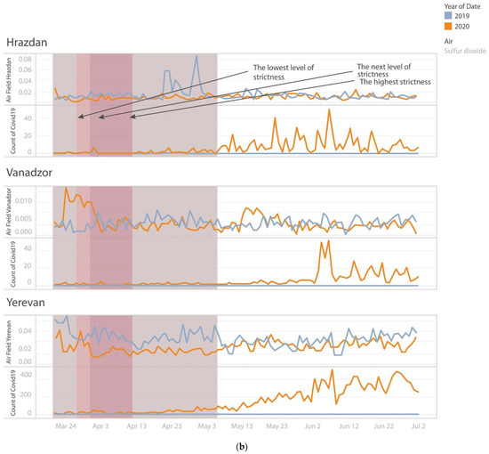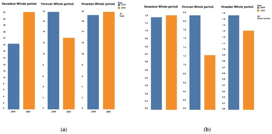 As the source of SO2 in the atmosphere is the burning of fossil fuels by power plants, other industrial processes as well as trains, other vehicles and heavy equipment which burn fuel containing sulfur, the content of SO2 in the air is expected to decrease during a lockdown [45]. The decreased concentration of SO2 in the air of Yerevan, Hrazdan and Vanadzor during the lockdown was consistent with reports in the literature. The same pattern was observed in many countries and cities during the period of COVID-19-related restrictions—e.g., in six different cities of Latin America, in Hanoi, Salé city (North-Western Morocco), Malaysia etc. [24,46,47].