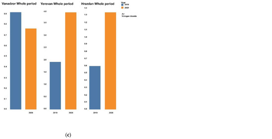 Cumulative concentrations of dust (a), sulfur dioxide (b) and nitrogen dioxide (c) in Yerevan, Vanadzor and Hrazdan during March–June in 2019 and 2020.