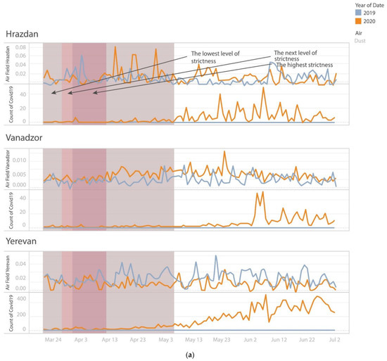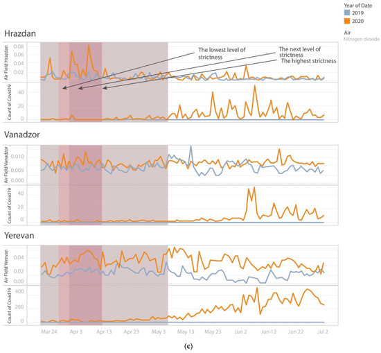 Concentrations of dust (a), sulfur dioxide (b) and nitrogen dioxide (c) and new cases of COVID-19 in Yerevan, Vanadzor and Hrazdan during March–June in 2019 and 2020 during the periods of different levels of stringency in terms of lockdown restrictions.