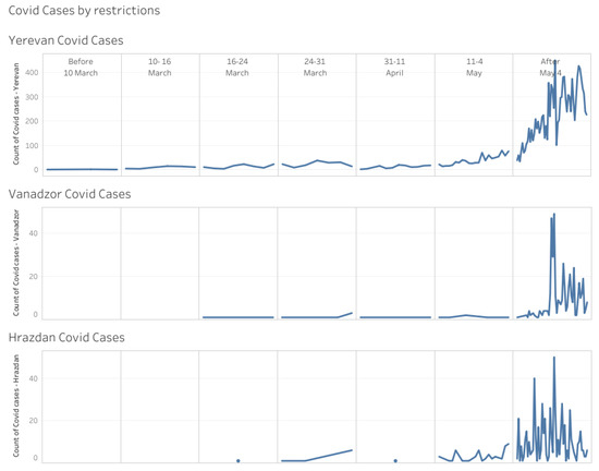 The numbers of new cases of COVID-19 started to increase after the lockdown measures were cancelled. In Yerevan and Hrazdan the increase was almost immediate; in Vanadzor increases were seen from the beginning of June. Figure 4 shows the dynamics of the new cases of COVID-19 more closely.