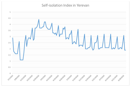 In order to receive information about the effectiveness of the lockdown, it was helpful to look at the mobility data of the population. In many countries around the world, it was possible to check the effectiveness of lockdowns using mobility data from Google and Apple. As these data were unavailable for Armenia, the lockdown in Armenia was demonstrated from Yandex.ru. In March 2020, Yandex introduced the Self-Isolation Index, which was measured on a scale from 0 to 5 points [66]. An index between 0 and 2.4 points showed that there were many people on the streets and the level of self-isolation was low. This was considered the red zone due to the high likelihood of spreading coronavirus. An index between 2.5 and 3.9 points indicated that most people were at home (yellow zone), and a score from 4 to 5 points meant that there was almost no one on the streets, which was a green zone and suggested a low likelihood of disease spread. Figure 5 shows to what degree people were self-isolating by way of not leaving their homes. From March 14 until May 7 the index was ≥2.5, reaching around 4 during the last days of March and the first week of April, meaning that Armenians living in Yerevan were quite compliant regarding the restrictions.