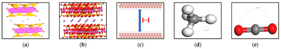Shale has the following three main components: organic matter, clay minerals, and non-clay minerals, while clay minerals are dominated by illite, montmorillonite, and illite/smectite formation [26,27,28,29,30]. In this paper, a montmorillonite cell model (shown in Figure 1a) was constructed by using the molecular simulation software, Material Studio, with sodium-based montmorillonite as the skeleton. The specific parameters of this cell model are a = 5.23 Å, b = 9.06 Å, c = 12.5 Å, α = 90°, β = 99°, and γ = 90°, and the atomic coordinate parameters are shown in Table 1 [31]. The montmorillonite slit model was then established by the steps of the tessellation of the cell, establishing the interface model, and performing supercell (shown in Figure 1c), where H denotes the pore size of the slit model, and the values of H taken in this paper are 1 nm, 2 nm, 3 nm, 4 nm, 5 nm, 6 nm, 8 nm, and 10 nm, respectively. The specific parameters of the final slit model are x = 52.30 Å, y = 45.30 Å, and z varies from 32 Å to 122 Å with different slit aperture sizes. To study the competitive adsorption pattern of CH4 and CO2 in sodium-based montmorillonite, this paper also established CH4 and CO2 models (shown in Figure 1d,e) based on the establishment of sodium-based montmorillonite. The bond length and bond angle parameters of the two fluid models are labeled in Figure 1d,e.