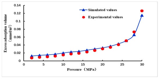 A low-pressure isothermal nitrogen adsorption simulation was performed using the established montmorillonite model, and the results obtained from the simulation were compared with those obtained from sodium-rich montmorillonite nitrogen adsorption experiments in Wyoming, USA [33] to verify the authenticity of the model. The results of the comparison are shown in Figure 2 (both experimental and simulated conditions are T = 334 K and P = 0–30 MPa), and it can be concluded that although there is an error between the isothermal adsorption simulation results and the experimental results, the error between the two is small, within 10%, indicating that the established sodium-rich montmorillonite model is more realistic and can represent the actual situation in the subsurface. The reason for the error is that the real sodium-rich montmorillonite in the subsurface has a more complex pore structure compared with the model.