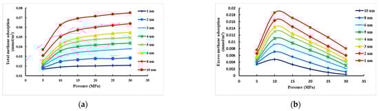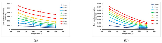 Figure 5 shows the values of CH4 adsorption at different temperatures for different montmorillonite slit pore sizes, respectively. Figure 5b shows that the excess adsorption decreases with increasing temperature. This is because, when the temperature increases, the effect of molecular kinetic energy change on the adsorption capacity of montmorillonite takes the major part, and the adsorption capacity is inversely proportional to the change of temperature, with the higher the temperature, the lower the adsorption capacity instead. From Figure 5b, it is easy to find that the adsorption capacity peak at the temperature of 278.0 K. From the comparison of the excess adsorption capacity of different montmorillonite slit pore sizes, the best adsorption effect of montmorillonite on CH4 was observed at the pore size of 1 nm and the worst at 10 nm.