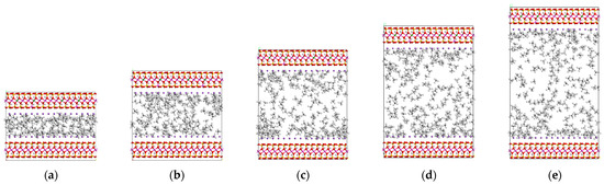 Figure 3 shows the total adsorption and excess adsorption of CH4 at different pressures with different slit pore sizes, respectively. From Figure 3b, it can be found that the adsorption capacity gradually increases from 0.0 MPa to 10.0 MPa when the pressure increases and reaches the peak at 10 MPa, then shows a decreasing trend in the interval from 10.0 MPa to 30.0 MPa. Since the adsorption of CH4 by montmorillonite slit is an interfacial phenomenon, the excess adsorption capacity will rise first and then fall. During the adsorption process, two kinds of forces exist at the interfacial interface between the montmorillonite slit wall and CH4. One is the mutual gravitational force between CH4 molecules, which is called gravitational force A. The other is the gravitational force of the montmorillonite slit wall on CH4, which is called gravitational force B. When gravitational force A is smaller than gravitational force B, a potential trap occurs, and most of the CH4 accumulates on both sides of the montmorillonite slit under the action of gravitational force B. This is due to the imbalance of gravitational forces. This phenomenon of the uneven density distribution of adsorbents due to the unbalanced gravitational force is the adsorption phenomenon. When the pressure is greater than 10.0 MPa, the bulk phase density of CH4 becomes larger, so the gravitational force A gradually becomes larger, and the corresponding gravitational force B starts to decrease. This change in the gravitational force relationship directly affects the density distribution of CH4 and the excess adsorption of montmorillonite slits. It is also shown in Figure 3b that the larger the pore size of the montmorillonite slit, the lower the capacity of the excess adsorption of CH4. The three-dimensional configuration of the montmorillonite slit for some pore sizes is shown in Figure 4.