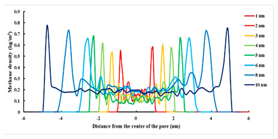 Figure 6 shows the density comparison of CH4 under different pore sizes of the montmorillonite slit. It can be found in Figure 6 that the peak of CH4 density distribution is located near the wall of the montmorillonite slit. Moreover, when the width of the oxidized montmorillonite slit pore size is 1 nm, most of the CH4 is attached to both sides of the slit and exists in the adsorption state. When the slit width is 2~5 nm, most of the CH4 is still attached to the slit wall, but some of it is also dispersed in the pores in the middle of the slit. When the slit width is 6~10 nm, the density of CH4 dispersed in the pores increases some more compared with 2~5 nm. Therefore, there are two occurrences of CH4 in the slit of montmorillonite with different pore sizes. In the small pore size, CH4 is mainly in the adsorbed state, and as the slit width increases, the free state of CH4 becomes more, and the two occurrences in the slit will coexist.