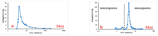 Pore size distribution curve of montmorillonite samples ((a) obtained by BJH method, (b) obtained by NLDFT method) [18]. Reproduced with permission from Xiong J., Doctoral thesis of Southwest Petroleum University; published by Southwest Petroleum University, 2015.
