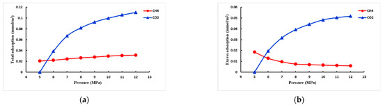 The pore size distribution curve of montmorillonite samples (Figure 8) shows that the pore size of montmorillonite is relatively small, dominated by micropores and mesopores less than 10 nm, and peaks between 5 nm and 6 nm, which indicates that the size of montmorillonite pores in shale is mainly concentrated in 5~6 nm [26]. Therefore, in this paper, a montmorillonite slit of 5 nm was used to conduct a simulation study of the competitive adsorption of CH4 and CO2. The simulation method used is consistent with Section 2.1. Two sets of conditions were set for the simulation: one set with a constant temperature of 298 K, the constant initial pressure of 5 MPa for CH4, and eight pressure points (0 MPa to 7 MPa) for CO2 pressure, whose group purpose was to analyze the CO2 adsorption capacity in the mixed phase of CH4 and CO2 and to predict the theoretical CO2 sequestration in montmorillonite. In another group with a constant temperature of 298 K and the initial pressures of CH4 and CO2 set to the same value, with 6 pressure points (5~10 MPa), the purpose of this group is to calculate the CO2/CH4 competitive adsorption ratio.