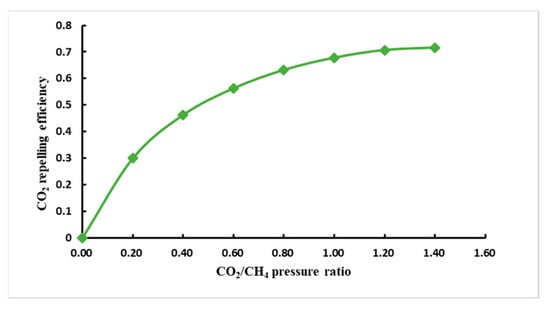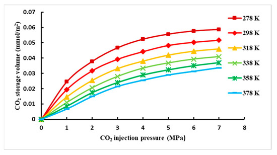 Figure 9 shows the total adsorption and excess adsorption curves of the two fluids with a constant initial pressure of CH4 and varying initial pressure of CO2. From Figure 9, it can be found that the excess adsorption of CH4 gradually decreases (from 0.019 mmol/m2 to 0.006 mmol/m2) and the excess adsorption of CO2 gradually increases (from 0.00 mmol/m2 to 0.052 mmol/m2) as the initial pressure of CO2 increases. In addition, the CO2-repelling CH4 efficiency curve (shown in Figure 10) was obtained by computational processing in this paper, and Figure 10 shows that the CO2 repelling efficiency increases with the increase in the initial pressure of CO2. Figure 11 shows the comparison curves of the CO2 storage volume at different temperatures and different CO2 injection pressures, from which it can be concluded that the CO2 storage volume gradually decreases with the increase in temperature, and the higher the temperature, the smaller the decrease in storage volume. With the increase in CO2 injection pressure, the storage volume gradually increases, and the higher the pressure, the smaller the increase in storage volume.