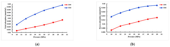 The adsorption capacity of two fluids (a): Total adsorption capacity, (b): Excess adsorption capacity.